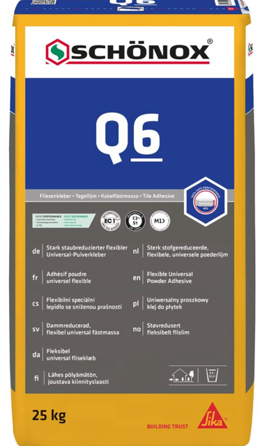 Hydraulisch verhardende, hoog flexibele, zeer verbruiks- en verwerkingen geoptimaliseerde, stofarme poederlijm met lichtgewicht vulstoffen. I.v.m. de meest duurzame grondstoffen en innovatieve productiemethodes ontstaat er bij het aanmaken van SCHÖNOX Q6 met water ca. 90% minder stof. SCHÖNOX Q6 is universeel geschikt voor de dun-, middel- en dikbed methode op wanden en vloeren, tevens geschikt als vloeibedlijm op vloeren.